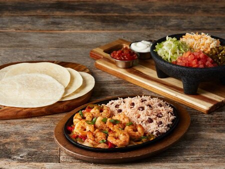 10oz of freshly grilled Canadian Beef Tenderloin on top of a sizzlin' skillet with sautéed veggies, Southwest rice and black beans. Served with tortillas and all the trimmings